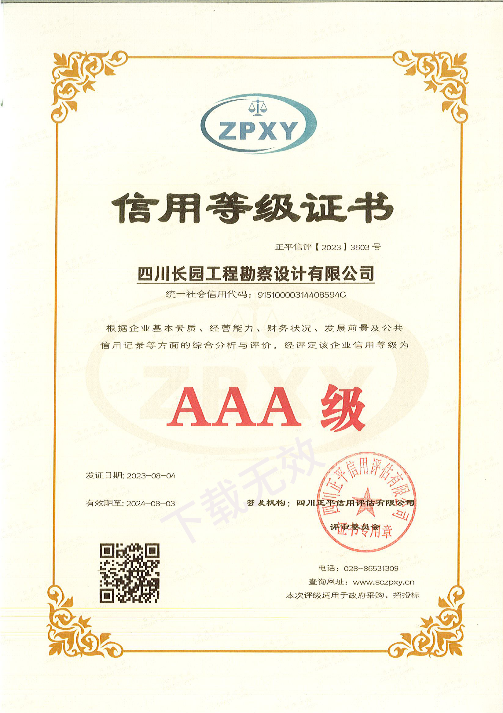 AAA信用等级证书