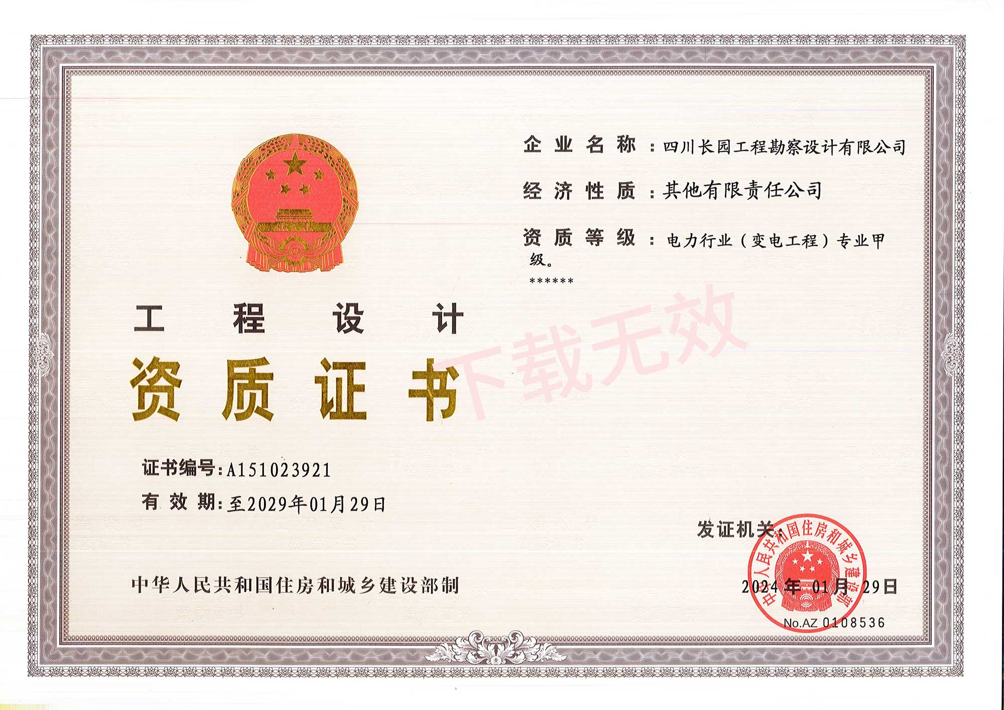工程设计资质证书甲级(变电工程)