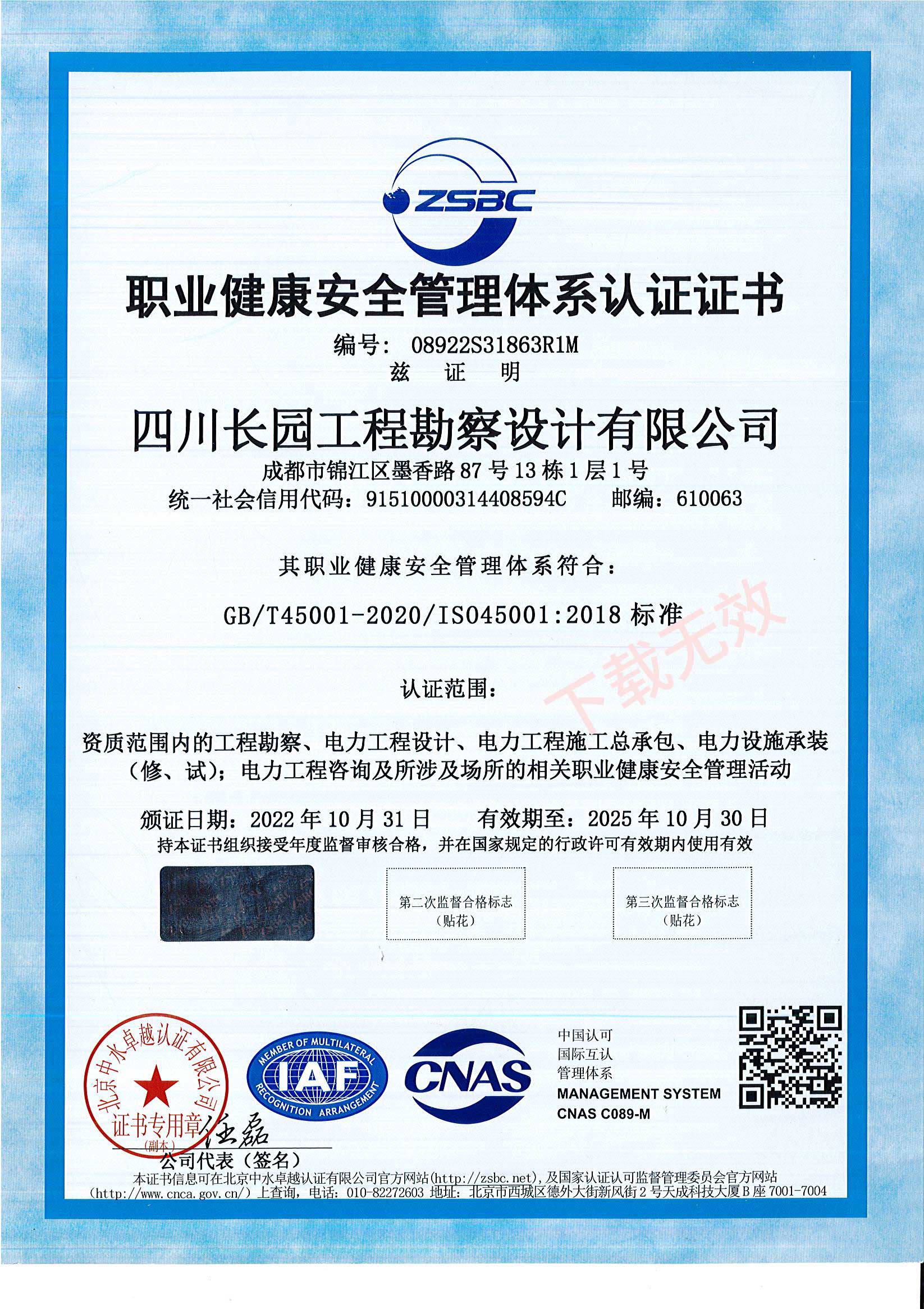职业健康安全管理体系认证证书